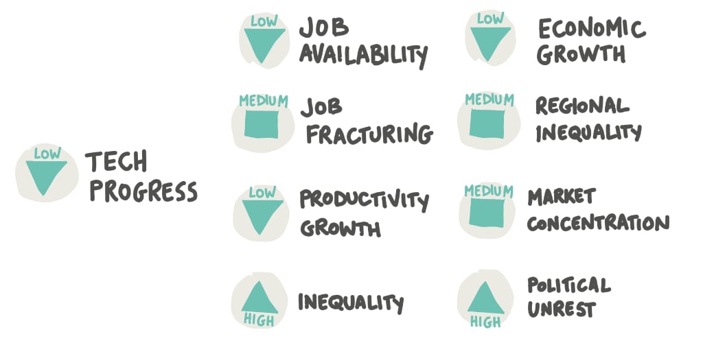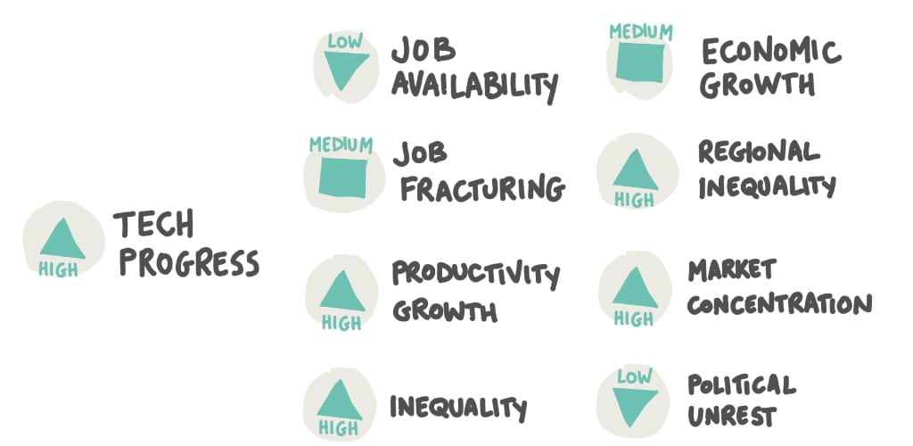 La maggior parte delle previsioni sull’effetto delle tecnologie sul mondo del lavoro si ferma a conseguenza superficiali e di primo ordine. Sappiamo benissimo che queste non sono le uniche conseguenze possibile e occorre estendere l’orizzonte di analisi anche sulle conseguenze di secondo o terzo ordine.