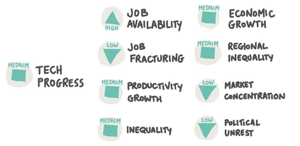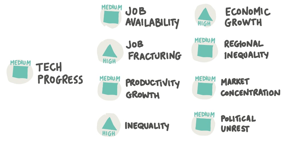 Ci sono, inoltre, elementi di incertezza non-tecnologica, come ad esempio: l’economia globale, gli squilibri regionali, bilanci di flussi migratori, concentrazione di mercato, la voce dei lavoratori, l’attitudine verso il lavoro e le strategie aziendali riguardo la forza lavoro.