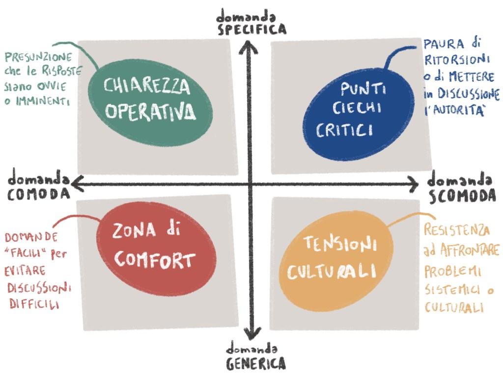 Le domande “comode” di una organizzazione potrebbero essere le domande “scomode” in un’altra, e viceversa: ho osservato organizzazioni in cui la parola “fallimento” non poteva essere detta, così come mi sono capitate organizzazioni in cui non si potevano mettere in discussioni argomenti tabù (es. non si poteva parlare delle difficoltà derivanti dallo smart working).