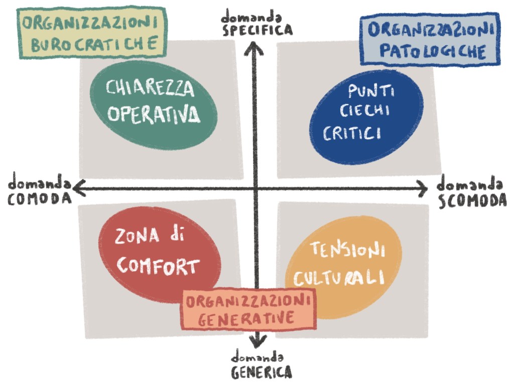 Senza entrare nel dettaglio delle caratteristiche di ciascun tipo di organizzazione, ti condivido rapidamente un esempio di come il tipo di domande non fatte possono raccontarci del tipo di organizzazione in cui ci troviamo.